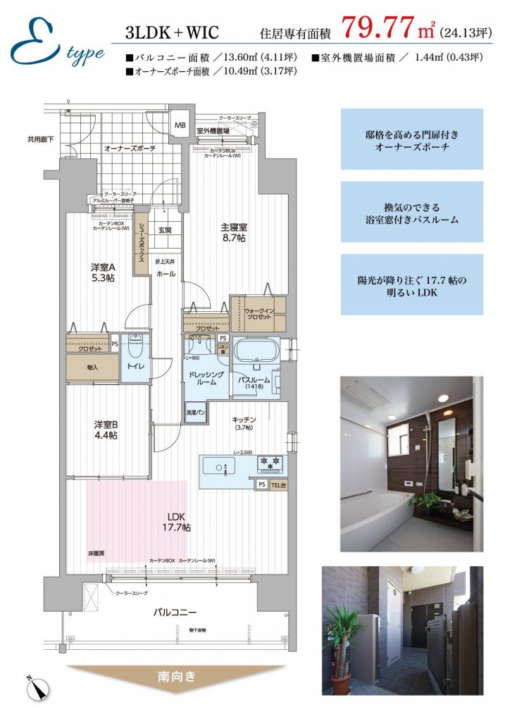 お部屋タイプはEタイプ79.77㎡で、17.7帖のリビング、8.7帖の主寝室とゆとりある広さや門扉の付いたオーナーズポーチなどが特徴のお部屋です!!