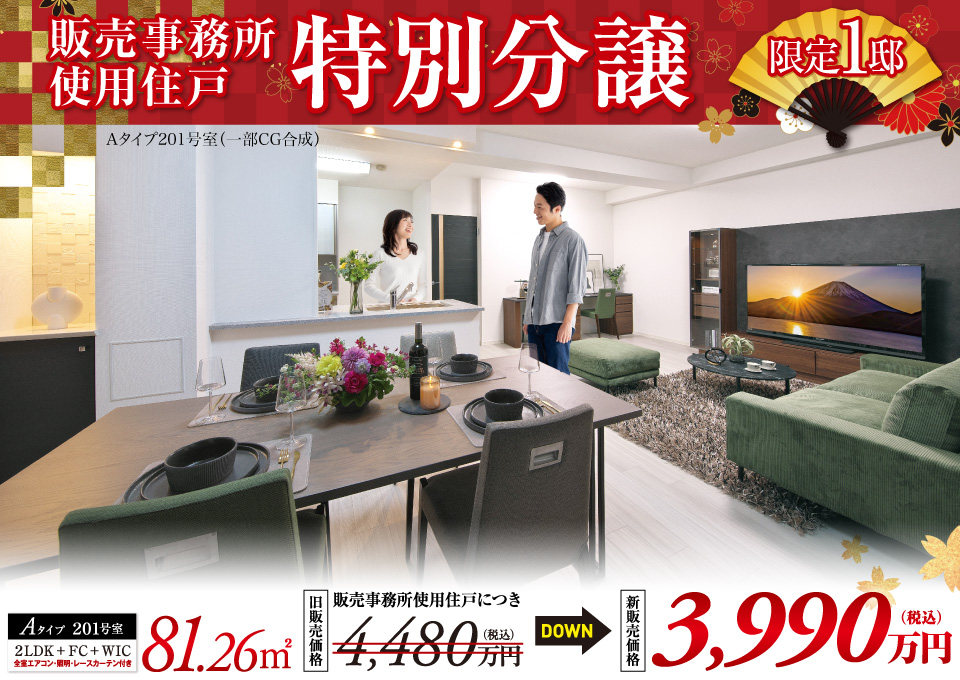 1.旧販売価格4,480万円(税込)→新販売価格3,990万円(税込)『旧価格公示日/2023年1月7日 新価格公示日/2025年12月26日』 2.対象住戸のAタイプ201号室は2024年7月より販売事務所として使用しています。 3.販売事務所の家具・家電は特別分譲に含まれません。4.現状有姿でのお引渡しとなります。 5.先着順販売につき、成約済の場合がございます。